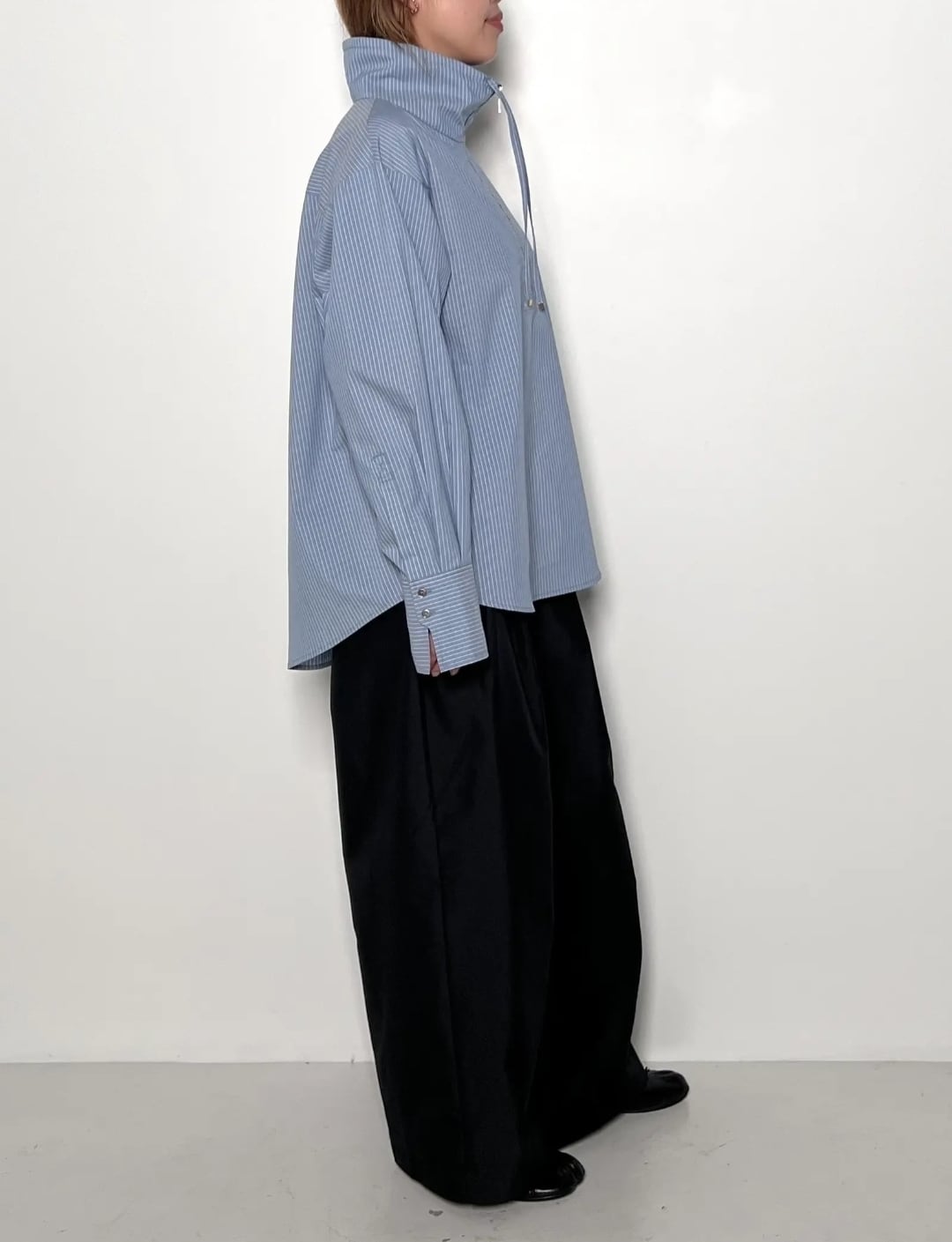 後身頃の斜めのタックや変形カフスなど、さりげないディティールに拘った1枚です。