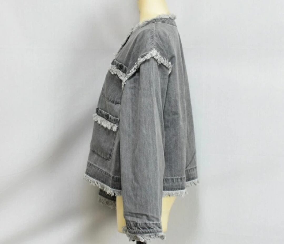 フリンジディティールが随所に施されたノーカラーデニムジャケットです。トレンド感と女性らしさを引き立てるフリンジが特徴です。コンパクトな着丈で、パンツスタイルからスカートスタイルまでバランスよくコーディネートできます。リラックスしたシルエットが今っぽく、定番のデニムジャケットにひと工夫加えた洗練されたアイテムです。同素材のスカートとのセットアップコーデも可能です。
