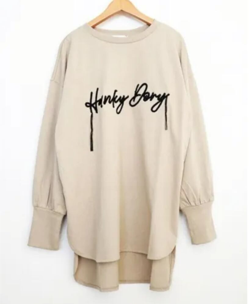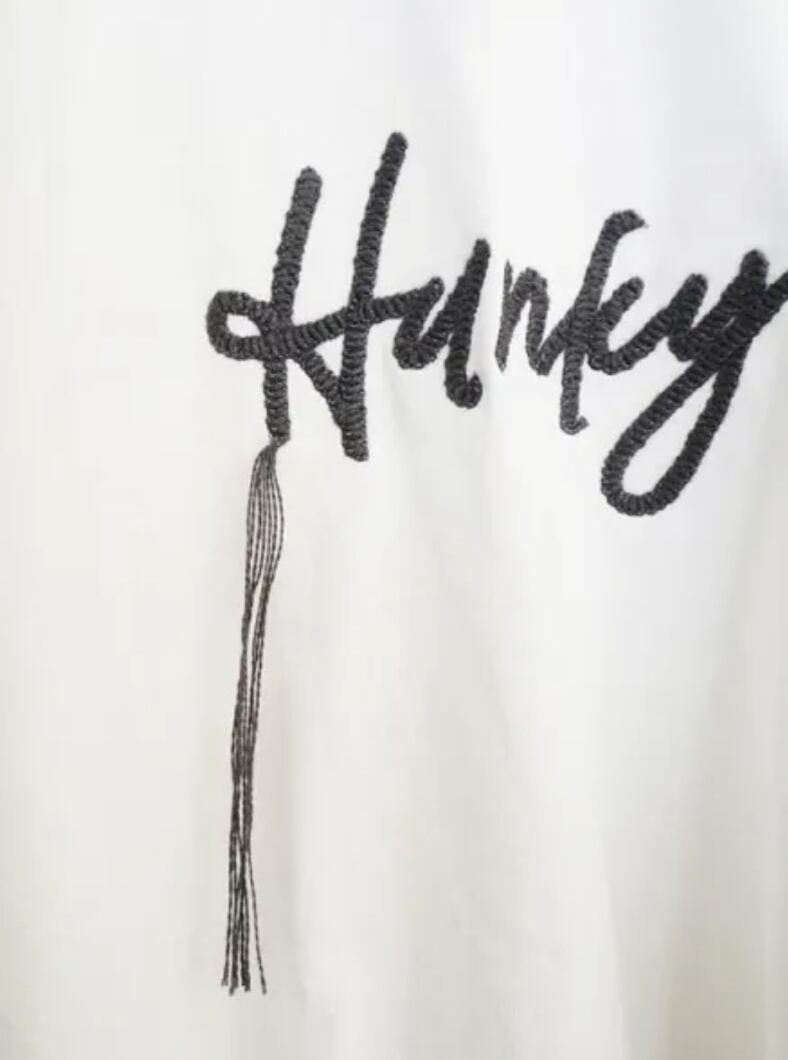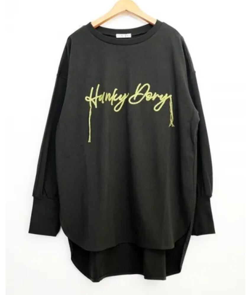 ほんのりボリュームスリーブでサイドスリット入り。パンツ、スカート、コーデ問わず使える一枚です。ロゴ刺繍の両サイドがフリンジになった遊び心のあるデザインです。