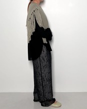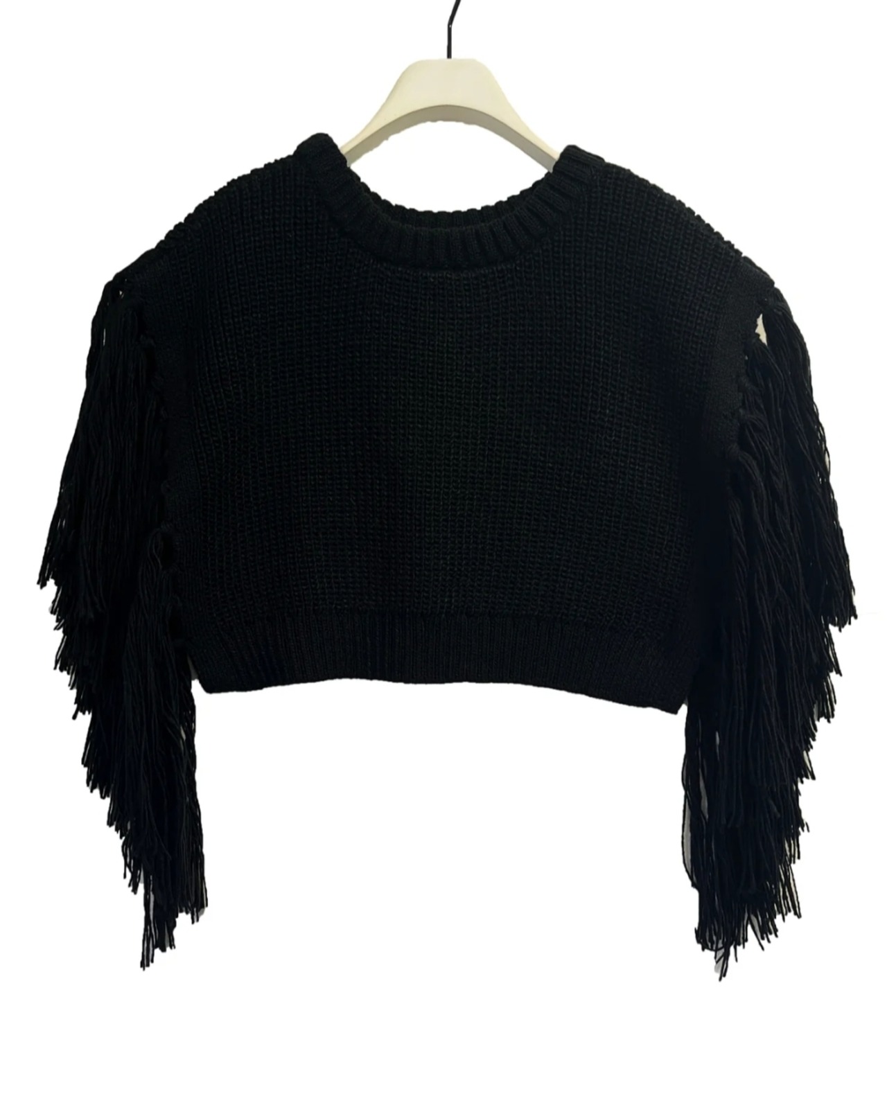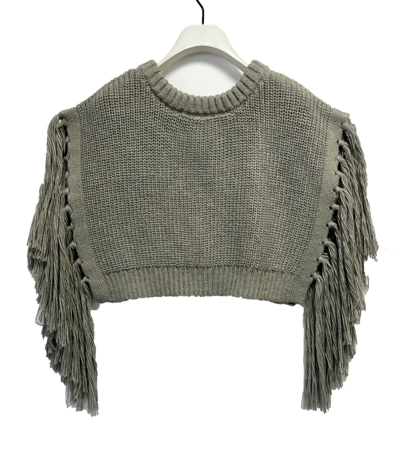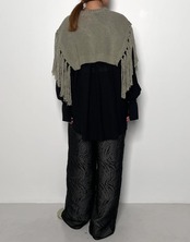 袖に施した存在感のあるフリンジと短丈の畦編み身頃が絶妙なバランスで今年らしいコーディネートのアクセントに。