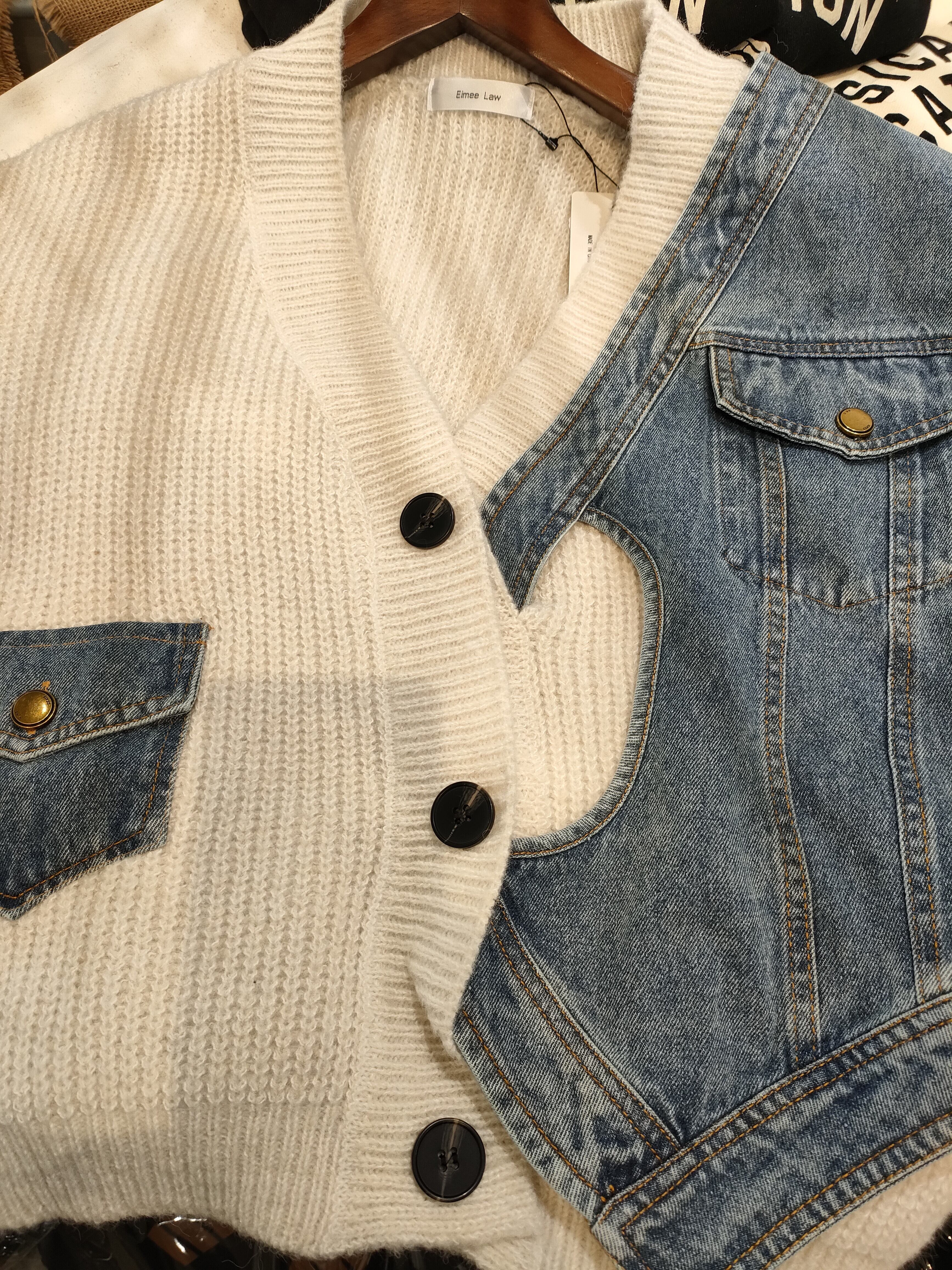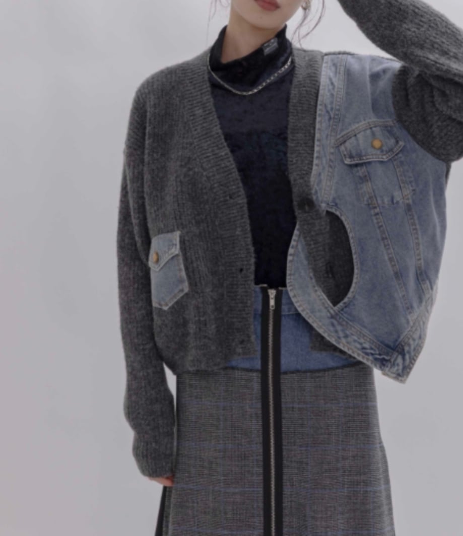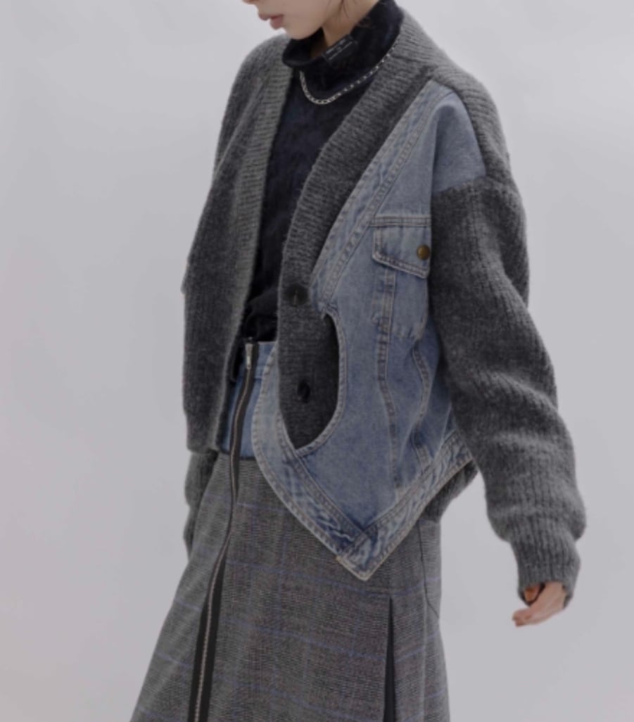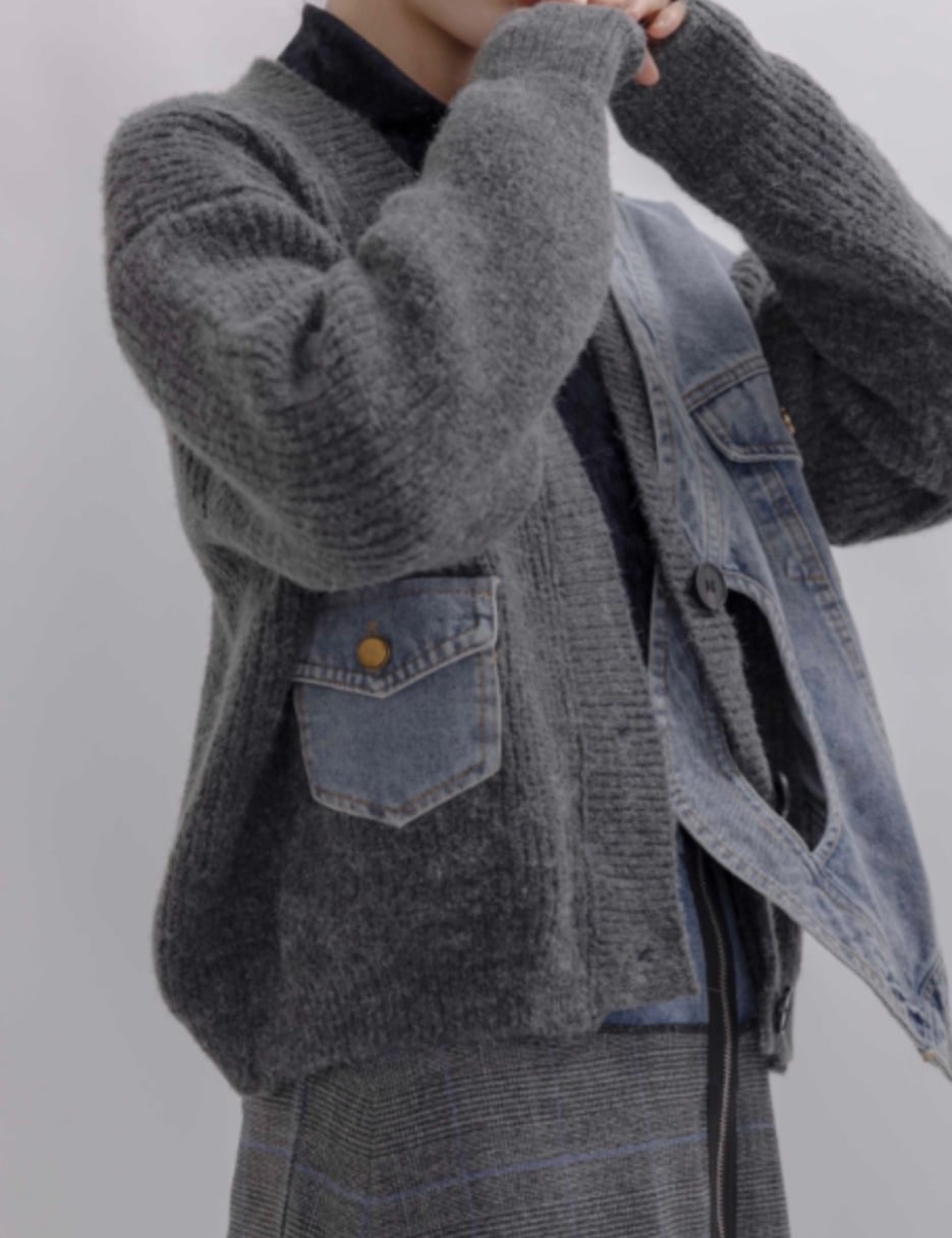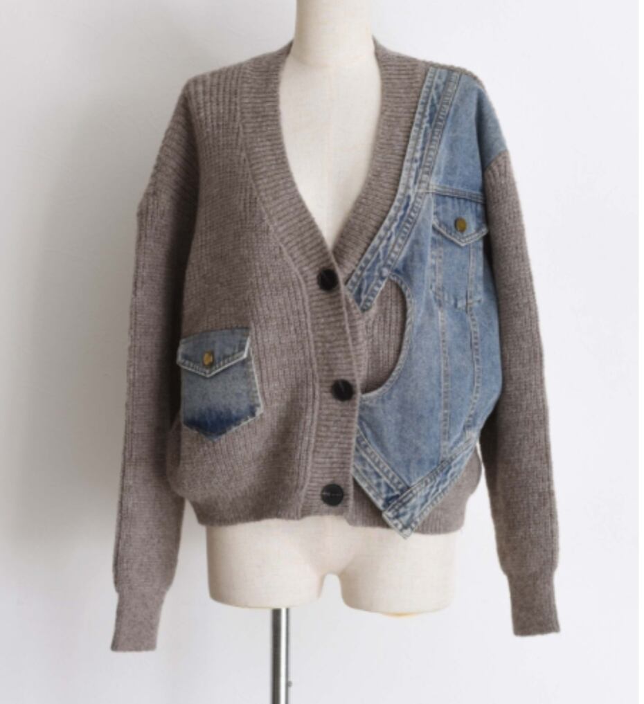 ざっくりニットとデニムがドッキングしたコンパクトなサイズ感のニットカーデ。
