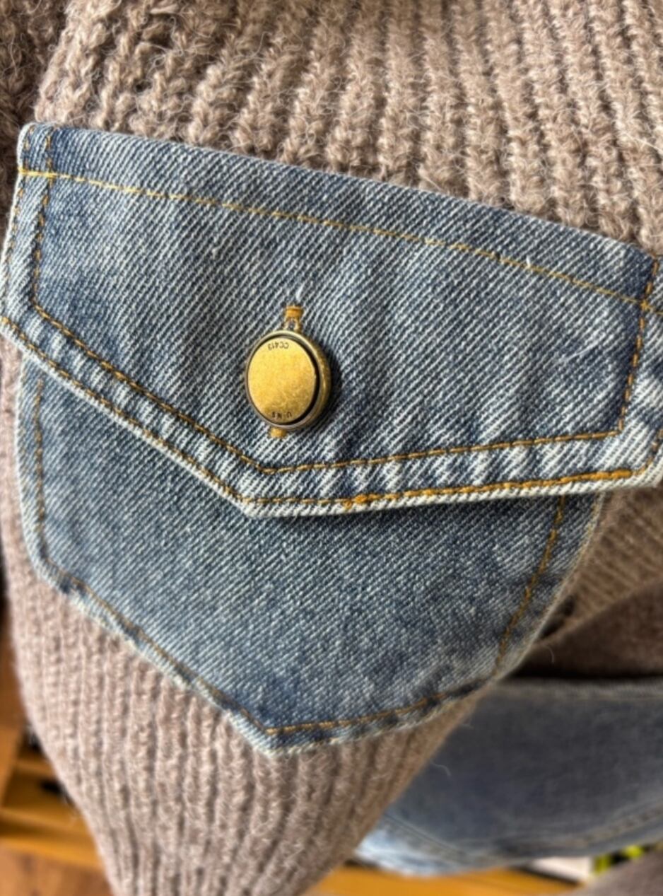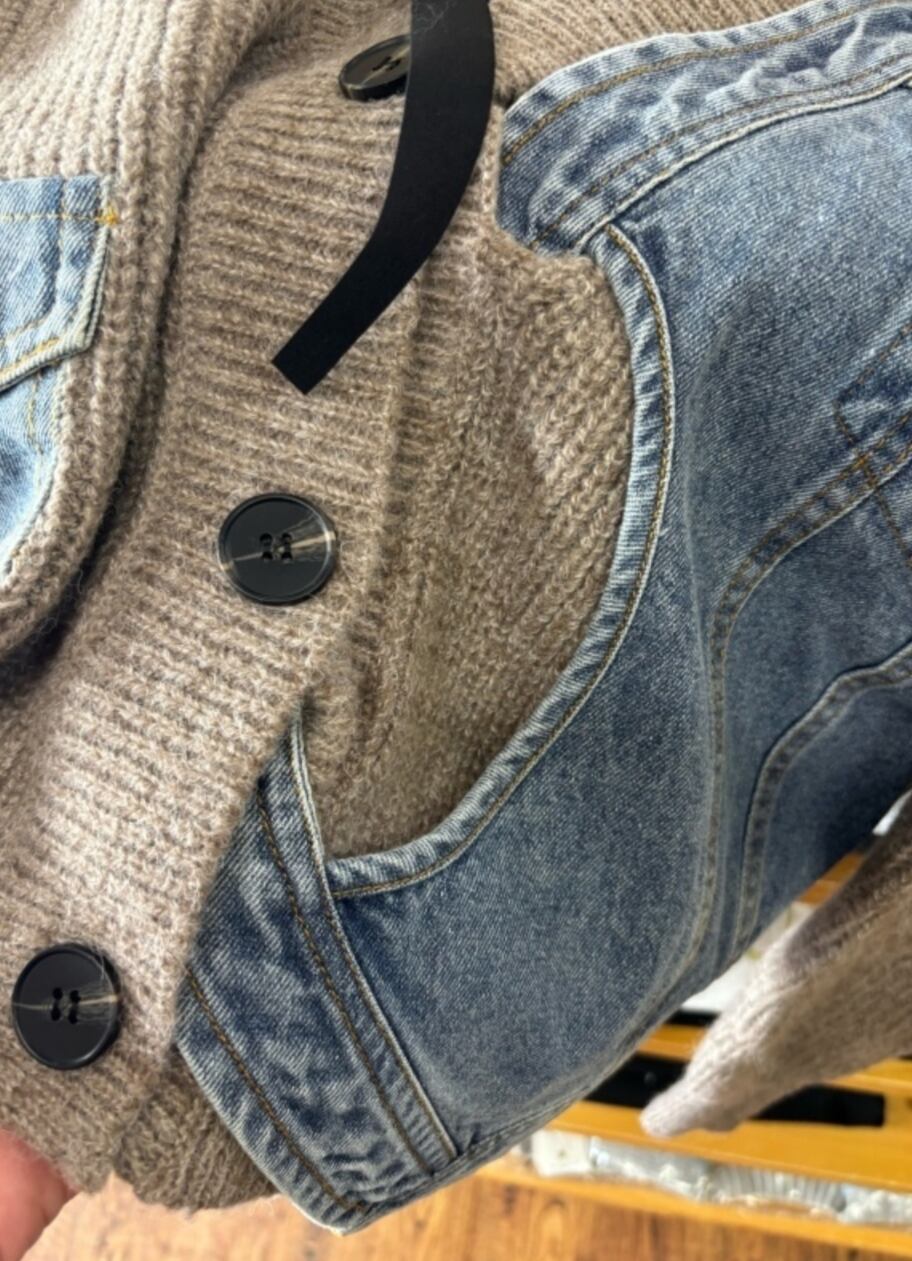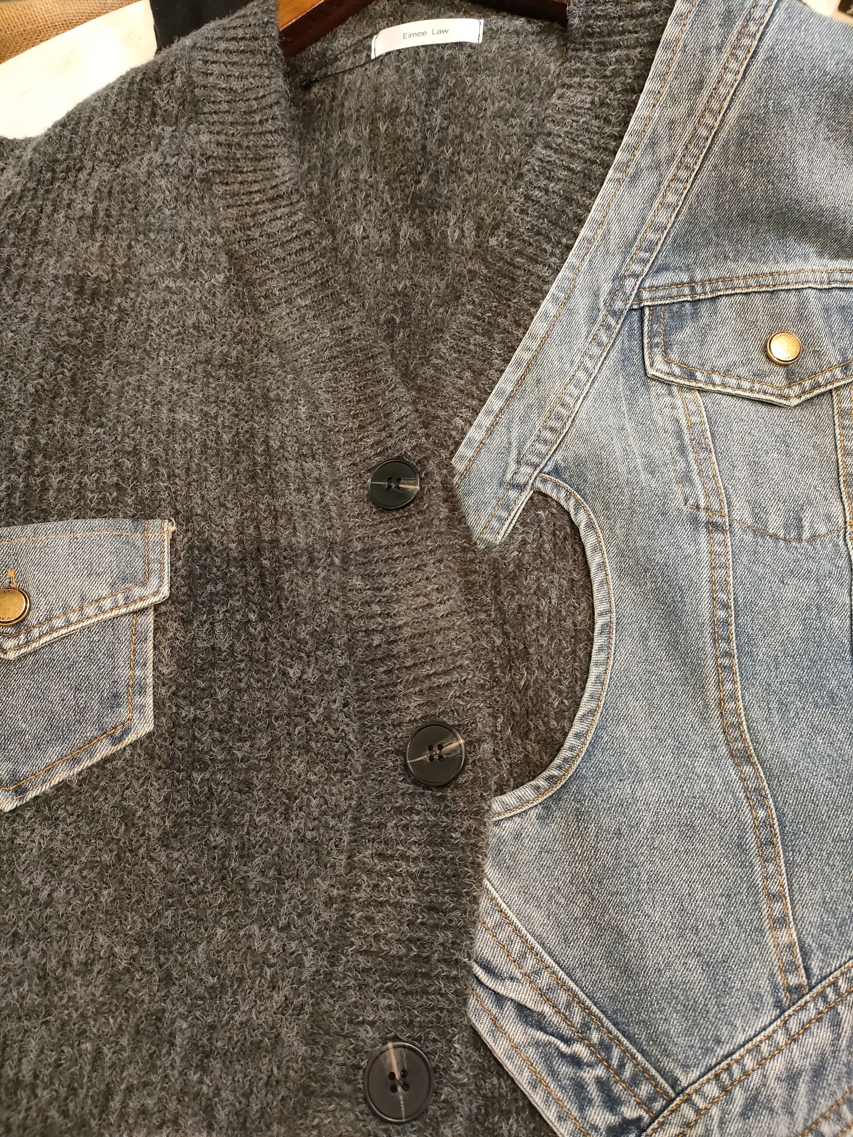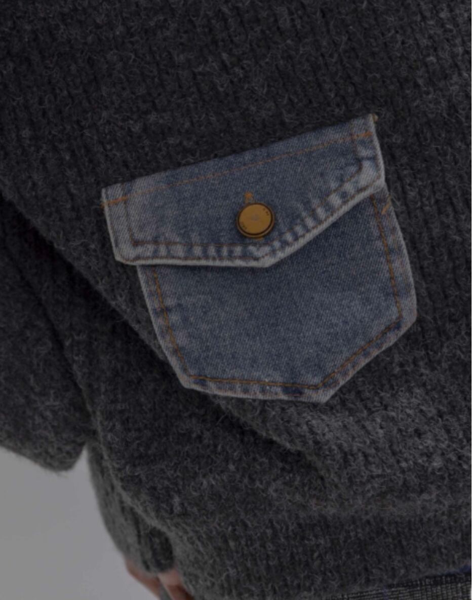 ざっくりニットとデニムがドッキングしたコンパクトなサイズ感のニットカーデ。