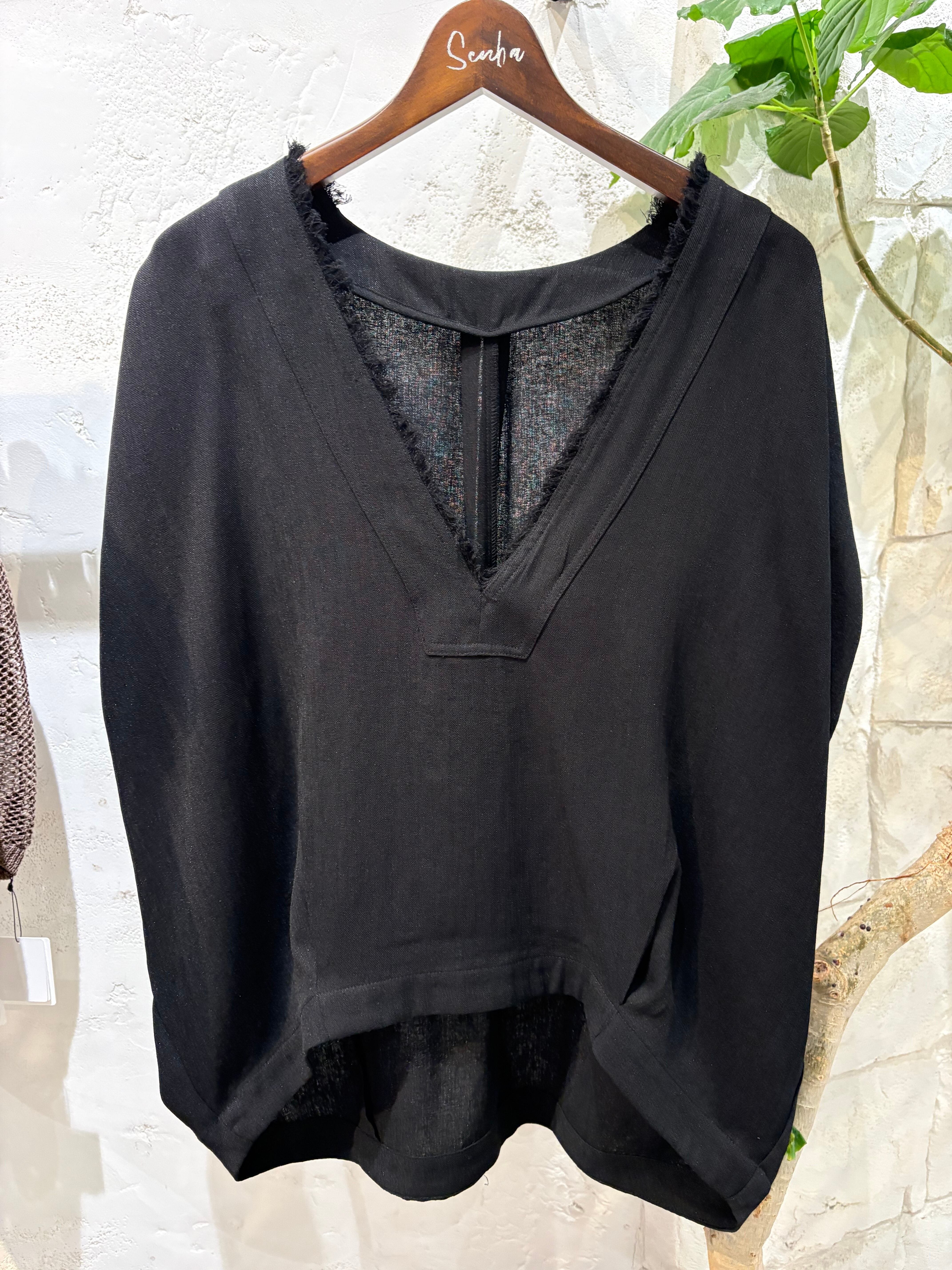 LUGIVA リネンライク バルーンVネックフリンジトップス 【102606】